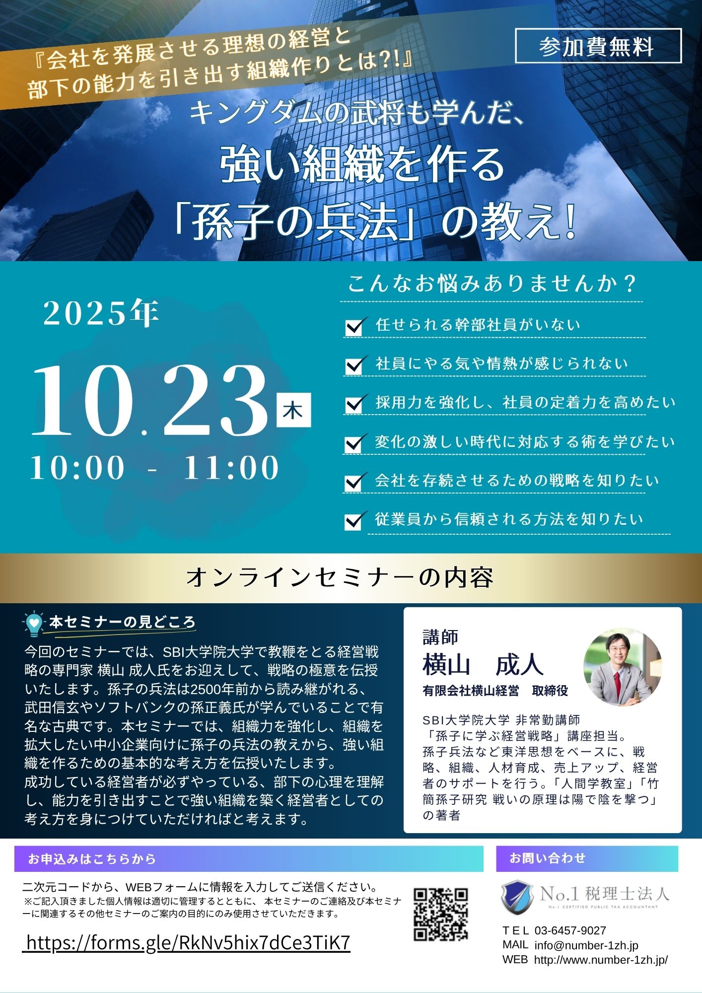 内容 | ・「孫子の兵法」に学ぶ理想の経営戦略 ・部下の心理を理解し、能力を引き出す組織づくり ・地力を蓄えて組織力を加速させる社員育成 今回のセミナーでは、SBI大学院大学で教鞭をとる経営戦 略の専門家 横山 成人 氏をお迎えして、戦略の極意を伝授 いたします。孫子の兵法は2500年前から読み継がれる、 武田信玄やソフトバンクの孫正義氏が学んでいることで有 名な古典です。本セミナーでは、組織力を強化し、組織を 拡大したい中小企業向けに孫子の兵法の教えから、強い組 織を作るための基本的な考え方を伝授いたします。 成功している経営者が必ずやっている、部下の心理を理解 し、能力を引き出すことで強い組織を築く経営者としての 考え方を身につけていただければと考えます。 |